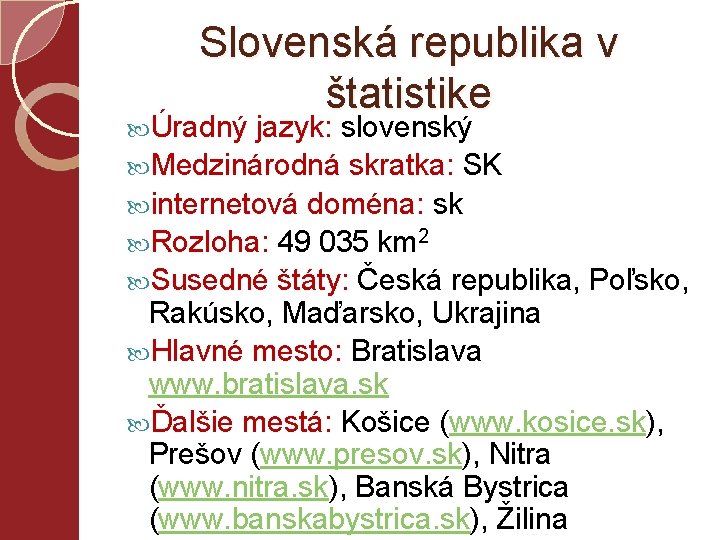 Slovenská republika v štatistike Úradný jazyk: slovenský Medzinárodná skratka: SK internetová doména: sk Rozloha: 49 035 km 2 Susedné štáty: Česká republika, Poľsko, Rakúsko, Maďarsko, Ukrajina Hlavné mesto: Bratislava www. bratislava. sk Ďalšie mestá: Košice (www. kosice. sk), Prešov (www. presov. sk), Nitra (www. nitra. sk), Banská Bystrica (www. banskabystrica. sk), Žilina