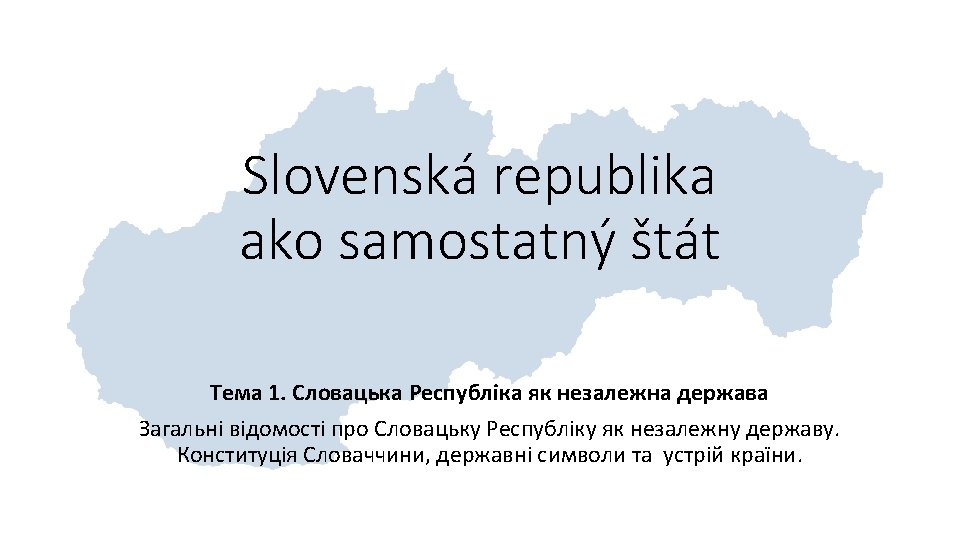 Slovensko – krajina v srdci Európy • vznik: 1. január 1993 • územie: 49 036 km² • obyvateľstvo: 5 450 000 • hustota obyvateľstva: 111 osôb/km² • hlavné mesto: Bratislava • mena: euro • štátny jazyk: slovenčina • štátne zriadenie: parlamentná demokracia • susedné štáty: Rakúsko, Česko, Poľsko, Ukrajina, Maďarsko