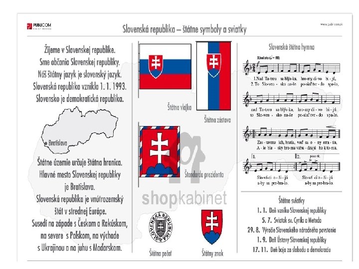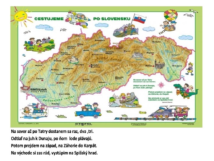 Slovensko, môj rodný kraj, mám ho veľmi rád. Príroda je ako raj, chodím do nej často krát. V riekach Dunaj, Hron a Váh, môžete sa člnkovať, v majestátnych našich horách, môžete sa lyžovať. Pamiatok tu máme dosť, v každom meste je ich veľa, vítaný je každý hosť, každý je nám za priateľa. Ľudia všetci, dobrí, milí, tak sa poďte pozrieť sem na tú našu krásnu zem.