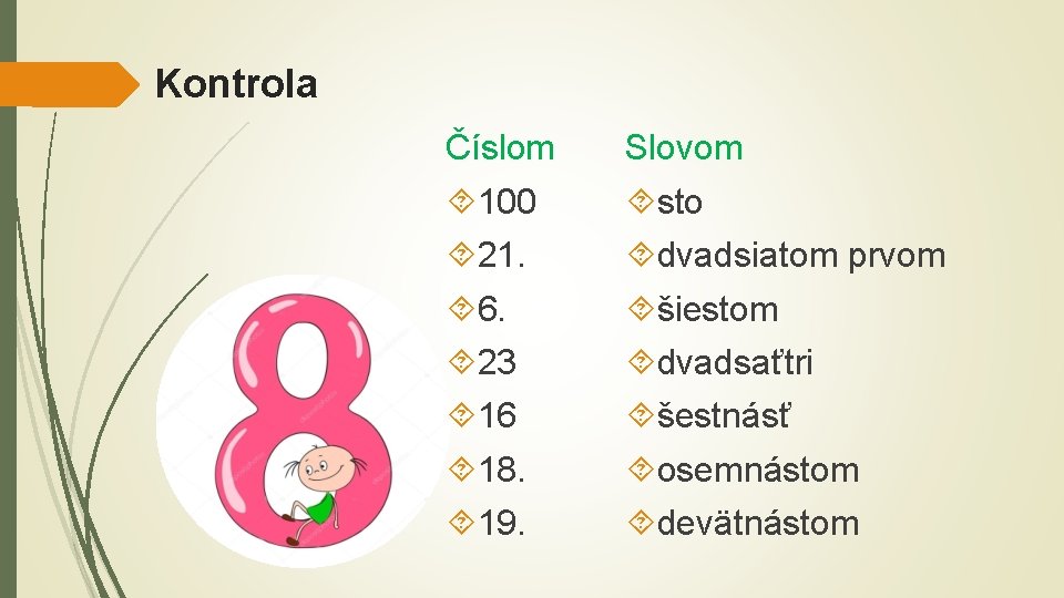 Kontrola Číslom Slovom 100 21. 6. 23 16 18. 19. sto dvadsiatom prvom šiestom dvadsaťtri šestnásť osemnástom devätnástom