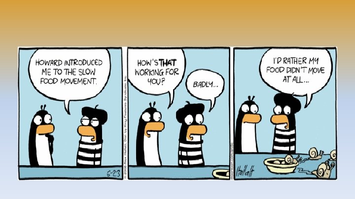 Go Slow in your life 1. Buy whole ingredients. Cook them. Eat them. 2. Avoid processed stuff with long ingredient lists. Eat real food. 3. Grow some of your own food. Even if just on your windowsill. 4. Whenever possible, know the story behind the food you buy. 5. Buy local food; find out what is in season!