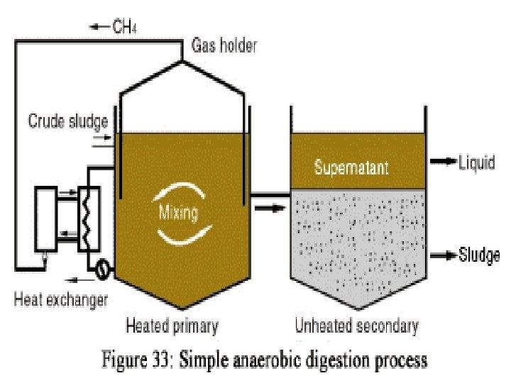 • Anaerobic digestion is usually carried out in a specially built digester, where the content is mixed and the digester maintained at 35◦C by combusting the biogas produced. • After digestion the sludge is passed to a sedimentation tank where the sludge is thickened. Biogas is collected from the digester. The thickened sludge requires further treatment prior to reuse or disposal.
