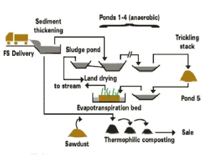 3. Dewatering/ Drying • Dewatering aims to reduce the water content further so that the solids content of the sludge is about 20 % (equivalent to 1 kg dry sludge with 4 L of water). The sludge can then be handled like a solid. • Dewatering can be done mechanically using a filter press (employing pressure or vacuum), or a centrifuge. • It can also be done using drying beds.