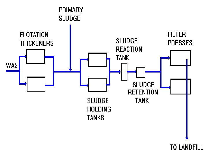 SLUDGE TREATMENT • Primary solids and secondary biosolids accumulated in a wastewater treatment process must be treated and disposed of in a safe and effective manner. • This material may be contaminated with toxic organic and inorganic compounds (e. g. heavy metals). • Options for sludge treatment include digestion, thickening, dewatering or drying and incineration. • The latter is most costly, because fuel is needed and air pollution control requires extensive treatment of the combustion gases. It can be used when the sludge is heavily contaminated with heavy metals or other undesirable pollutants. Prevention of contamination of the sludge by industrial wastes is preferable to incineration.