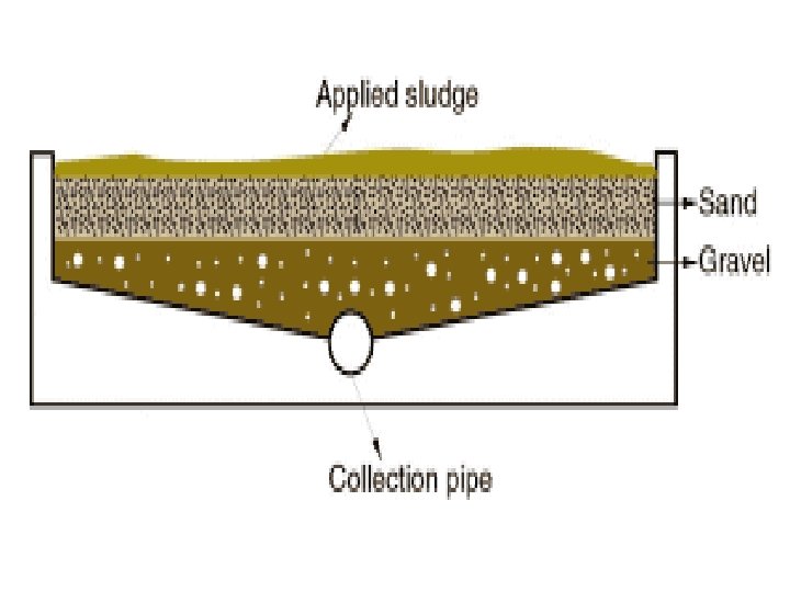 • A drying bed consists of a 30 cm bed of sand with an underdrainage. Sludge is applied on the sand bed and is allowed to dry by evaporation and drainage of excess water over a period of several weeks depending on climatic conditions. • Bacterial decomposition of the sludge takes place during the drying process while moisture content is sufficiently high. • During the rainy season the process may take a longer time to complete and sizing the area of the drying beds should take this into account.