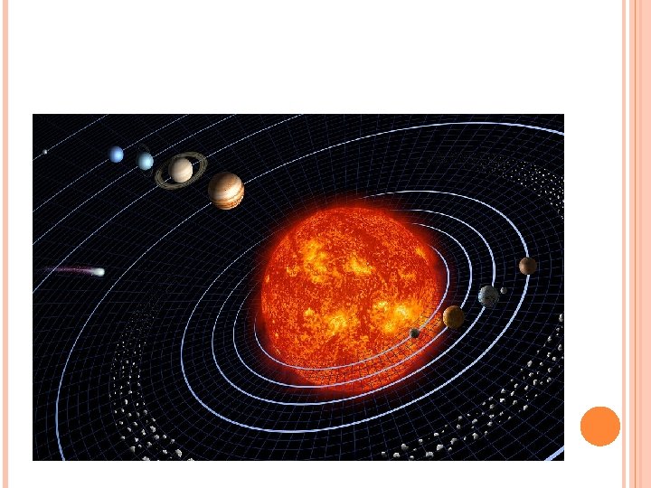 OBÍHAJÍCÍ TĚLESA Slunce je hlavním tělesem Sluneční soustavy, které má 745× větší hmotnost než všechny planety soustavy. Těžiště Sluneční soustavy se nachází blízko Slunce, podle působení ostatních planet je nad nebo pod jeho povrchem. Ostatní tělesa soustavy obíhají kolem tohoto těžiště v o mnoho řádů větších vzdálenostech, takže je korektní označit jejich oběh za oběh kolem Slunce. (planety, trpasličí planety, planetky, meteoroidy, komety a kosmický prach)