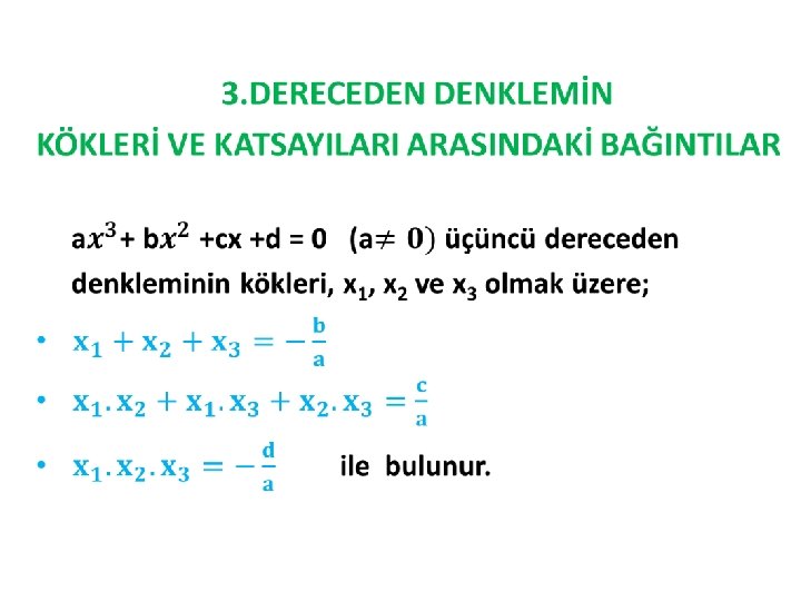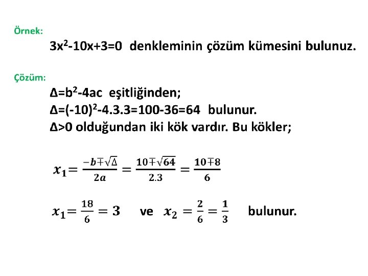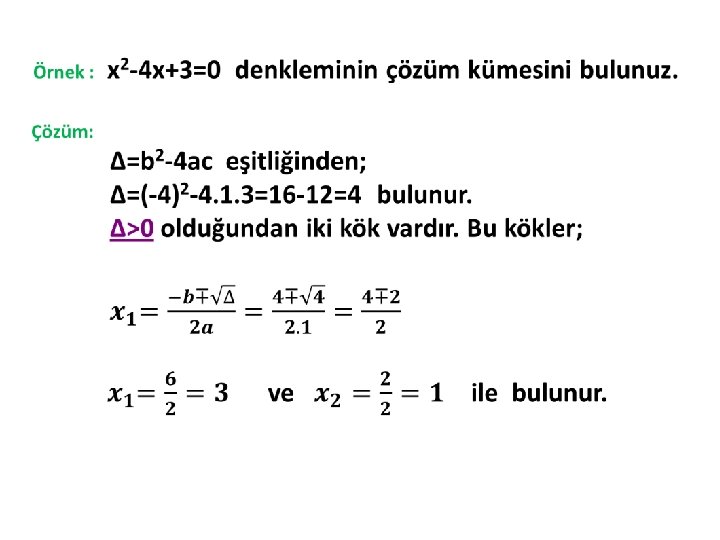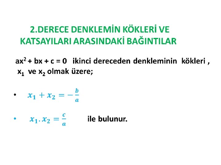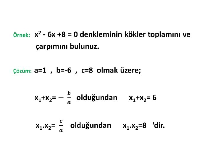 Örnek: Kökleri -5 ve -2 olan ikinci derece denklemi bulunuz. Çözüm: x 1+x 2= (-5)+(-2)=-7 x 1+x 2= (-5). (-2)=10 bulunur. x 2 - (x 1+x 2)+x 1. x 2=0 x 2 - (-7)x+10=0 x 2 +7 x +10 = 0 ile bulunur.