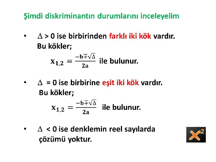 İkinci derece denklemin köklerinin varlığı araştırılırken; Δ = b 2 - 4 ac ifadesine bakılır. Bu değere ikinci derece denklemin DİSKRİMİNANTI (Delta) denir.