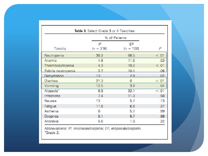 SWOG S 0124 Response rates with IP and EP were 60% and 57%, respectively (P =. 56). Median progression-free survival for IP and EP was 5. 8 and 5. 2 months, respectively (P =. 07). Median overall survival for IP and EP was 9. 9 and 9. 1 months, respectively (P =. 71). Severe diarrhea was more common with IP (19% v 3%); severe neutropenia and thrombocytopenia were higher with EP versus IP (68% v 33% and 15% v 4%, respectively)