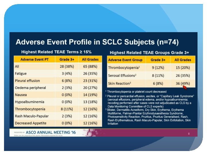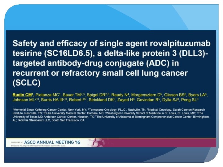 Single-agent activity in recurrent/refractory SCLC Comparable responses in second and third line Responses and survival improved vs. historical approved treatments First biomarker-directed therapy in SCLC Manageable safety profile Results justify further clinical development