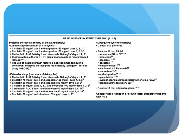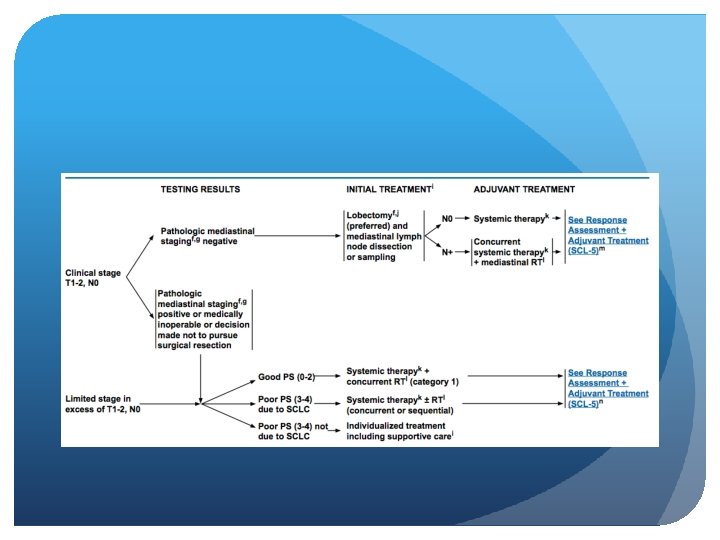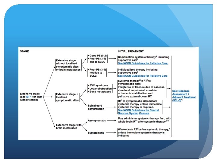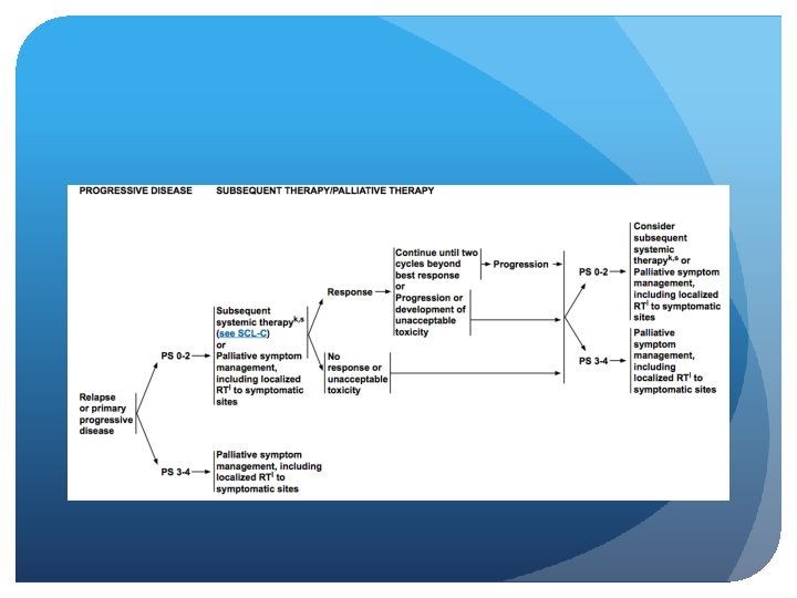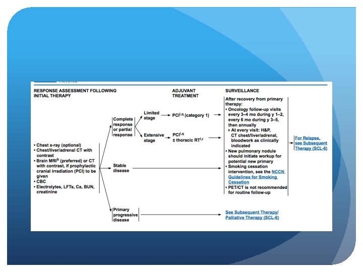 Limited vs. Extensive stage Limited stage Extensive stage Incidence 1 out of 3 people with SCLC 2 out of 3 people with SCLC Spread Only in one lung and perhaps in lymph nodes on the same side of the chest To other lung, to lymph nodes on the other side of the chest, or to distant organs Area confined to an area Wide spread Treatment chemo-radiation ± PCI Chemotherapy ± PCI Lung Cancer (small cell) Overview. American cancer society. http: //www. cancer. org/cancer/lungcancer-smallcell/overviewguide/lung-cancer-small-celloverview-staging Accesed july 9, 2014