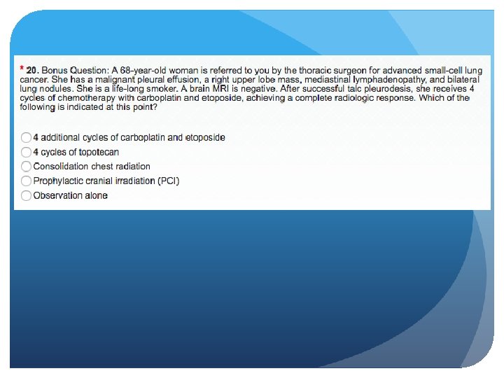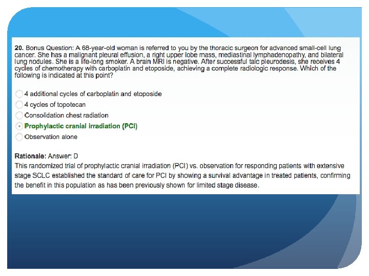 Prophylactic Cranial Irradiation EORTC Study Patients between the ages of 18 and 75 years with extensive stage small-cell lung cancer were randomly assigned to undergo prophylactic cranial irradiation (irradiation group) or receive no furtherapy (control group). The primary end point was the time to symptomatic brain metastases. CT or MRI of the brain was performed when any predefined key symptom suggestive of brain metastases was present. The two groups (each with 143 patients) were well balanced regarding baseline characteristics. Slotman et al, NEJM 2007