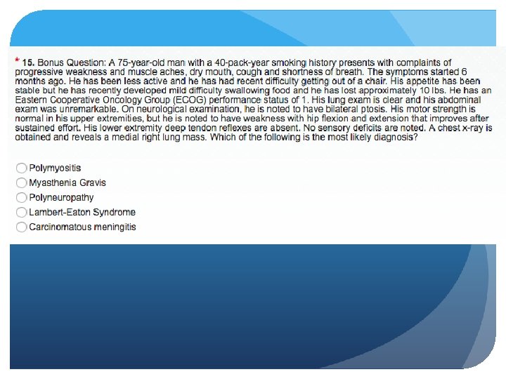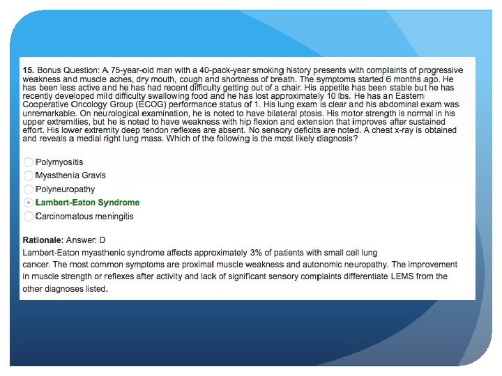 SCLC Paraneoplastic Syndromes SIADH ectopic ACTH production- Cushing’s syndrome Eaton-Lambert Myasthenic syndrome proximal muscle weakness that improves on repetition (“facilitation”) Hypercalcemia Peripheral Neuropathy