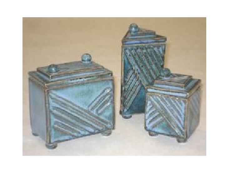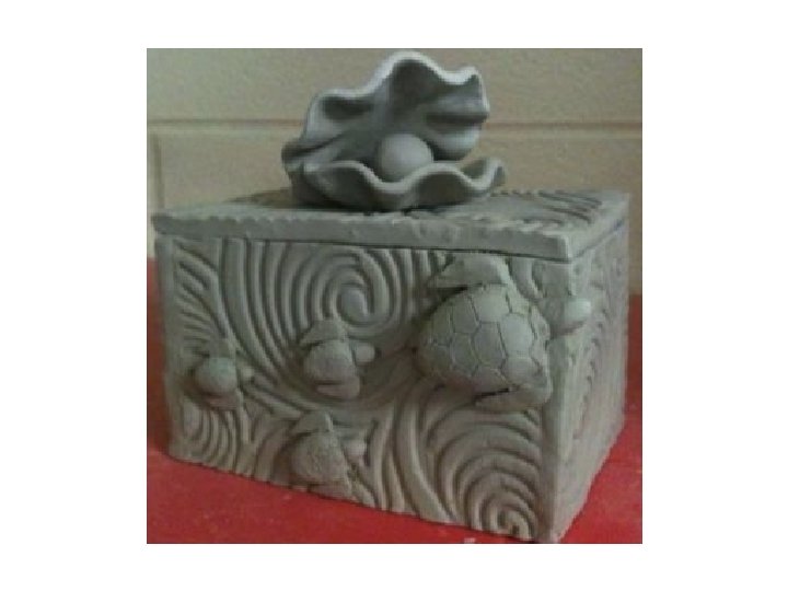 ARTISTIC PROCESS • What object will it hold? The size and form should relate to this object • SKETCH – Draw 2 -3 different sketches in your sketchbook. Draw in 3 -D! What will the additional detailing and design theme be? • USING A RULER – create a template or pattern that you will use to create a well-crafted box • Roll out your slabs. They should be between ¼ and 3/8 inch thick. • Use your templates to cut the slabs out of the larger slab. • Bevel the edges using our bevel tool if you are creating a geometric box • Let them get leather hard before joining so that they will be stable. • Score and slip to join. Add a thin coil to the seam to make the joint stronger • Cut the lid - think about the way it will stay in place – with a flange or notch in the lid? • Add a knob and any texture or decoration – using handbuilding and carving techniques. • You will be graded on Construction, Concept, Craftsmanship