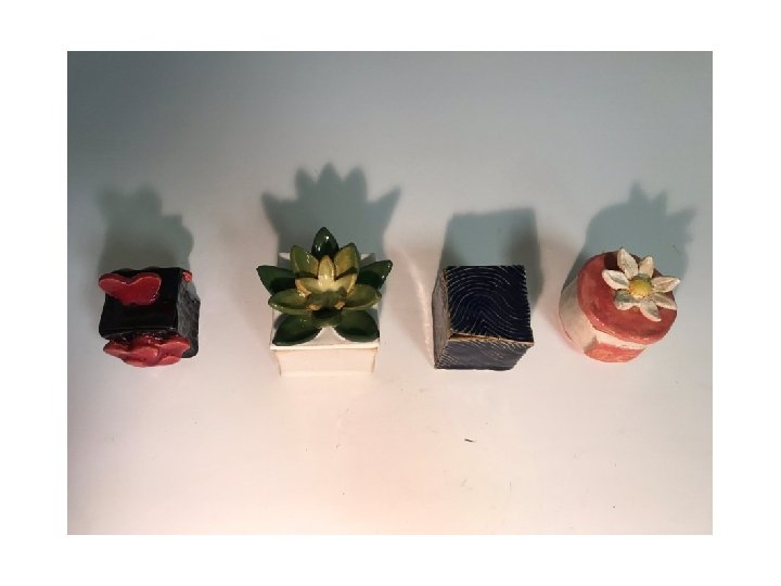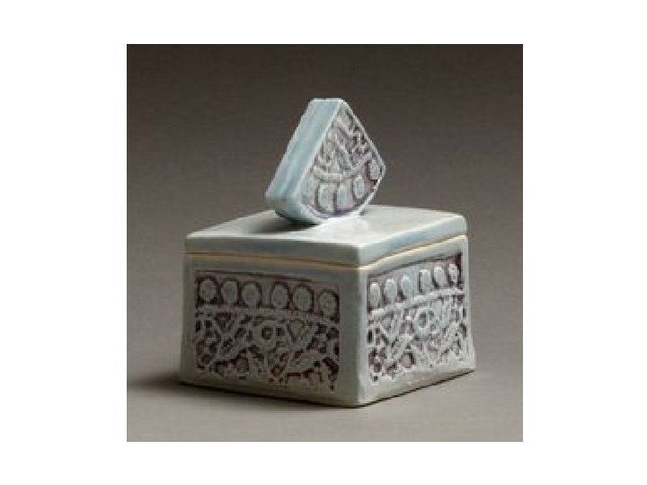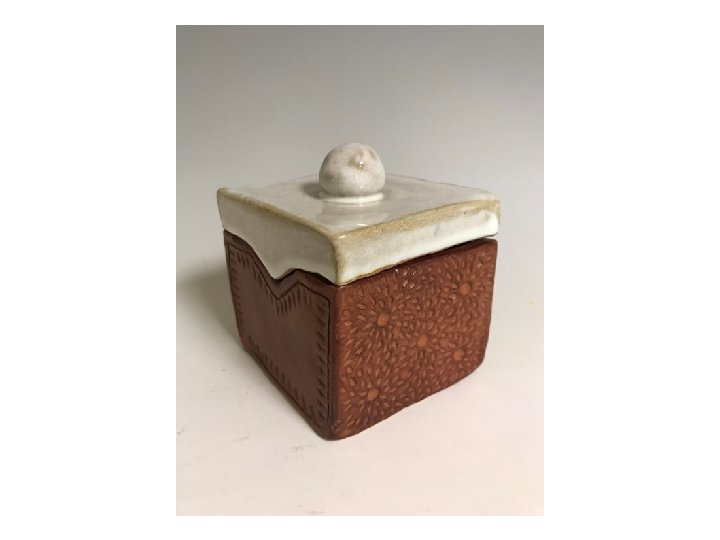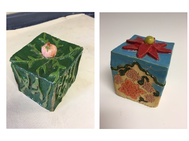 Small Lidded Box REQUIREMENTS • FORM – rectangular, cube, triangular or other • Must have a LID that fits – how will it connect/fit? Notch, groove or flange • Can have feet – will it be raised off the table? • Must have a SCULPTURAL KNOB or way to pull the lid off the container • Slab-built with good craftsmanship, proper joining of clay • Decorative Concept and/or Texture- Must have added elements or design theme. The theme or concept can relate to the object it holds or be more abstract • Your design must have AT LEAST one ADDITIVE element and one SUBTRACTIVE element • Small in size - No larger than 4 inches in height/width (approx. )