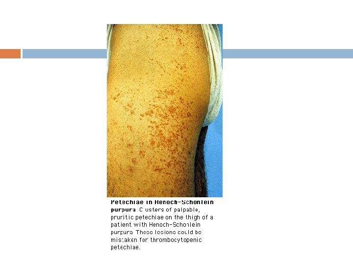 Clinical Manifestation Palpable purpura (the most skin manifestation) Arthritis / Arthralgia 75% Abdominal pain 50% Renal disease 21 -54% Scrotum involvement 2 -38% Central & peripheral Nervous system Eye : (Keratitis , Uveitis)