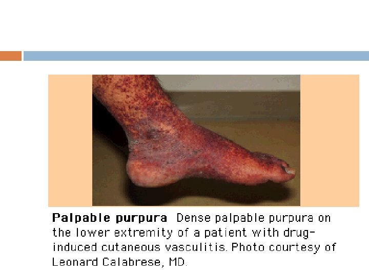 Clinical Manifestation skin involvement: palpable purpura (the most common) Sparing palmar, plantar, mucosal surface fever urticaria Arthralgias lymphadenopathy Visceral organ: (Renal, GI)