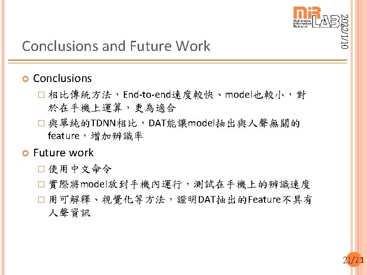 2022/1/10 Comparison Model CER #Para Resnet 15* 4. 2% 238 K TDNN+SWSA* 4. 19% 12 K DAT 4. 8% 10 K TDNN only 5. 2% 10 K * Other papers. 19/21