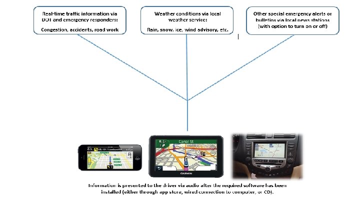 How it Works ● Taxis ○ Dispatch software that gives real-time information ○ Customer address and time to be picked up ○ Customer destination ○ Nearest unoccupied taxi will be dispatched ● Cars ○ Software update for factory and aftermarket GPS systems ○ Allows for spoken/pop-up notifications on traffic/road conditions, quickest routes, accidents, and misc. safety bulletins ○ Emphasis on real-time and quickly delivered information