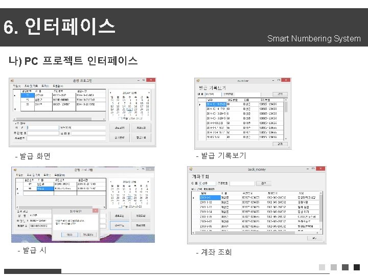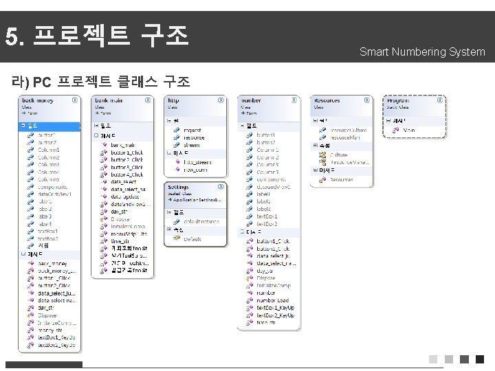 5. 프로젝트 구조 Smart Numbering System 다) PC 프로젝트 구조 View (Form) http. cs (Parsing된 데이터 를 읽어주는 Class ) PHP JSON Parsing C# Window Form Datebase