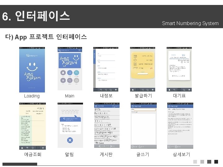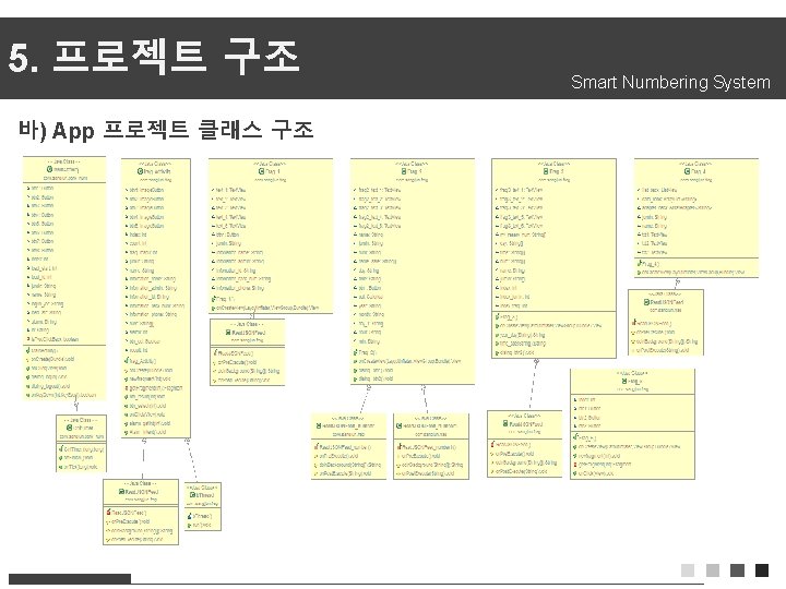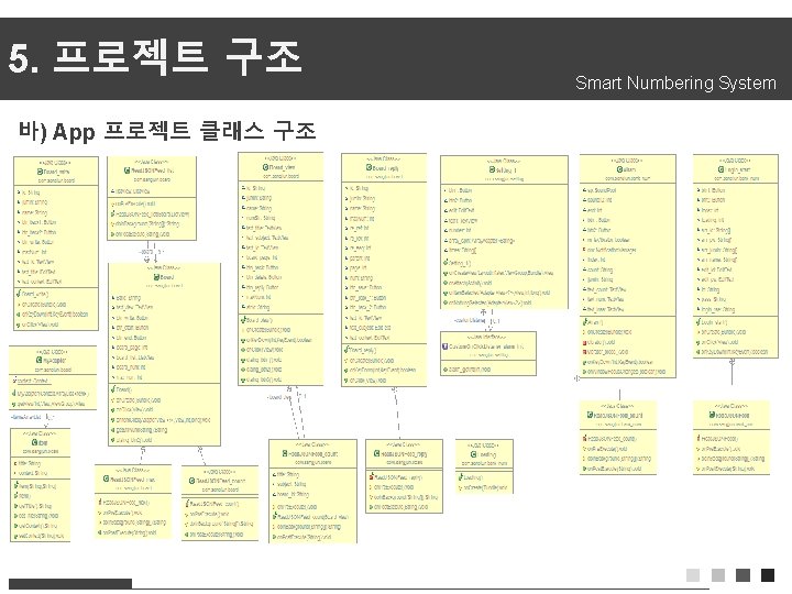 5. 프로젝트 구조 Smart Numbering System 마) App 프로젝트 구조 Readjson. java View (Loyout) Activity (Parsing된 데이터를 읽어주는 Class ) PHP JSON Parsing package Datebase