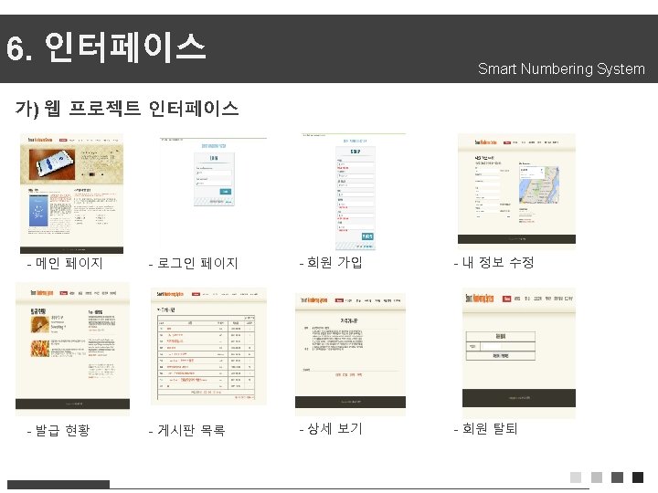 5. 프로젝트 구조 Smart Numbering System 가) 웹 프로젝트 구조 (MVC Modal 2) Service Web Browser Model (Bean, Dao 객체) request View(JSP ) Controller (Servlet) Datebase