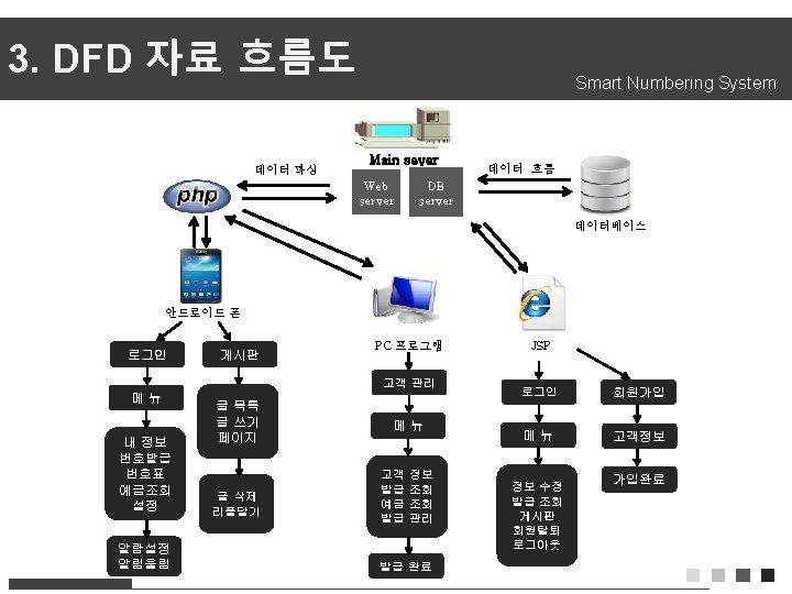 2. 개발 환경 v v v v v 운영체제: Windows 7, Android 데이터베이스: My. SQL 프로그래밍 언어: C#, JAVA, PHP IDE: Eclipse, Visual Studio Java Framework: Servlet 웹 기술: HTML 5, CSS 3, j. Query JSP 기술: 표현 언어(EL), 커스텀 태그, JSTL 사용 ORM Framework: My. Batis, Orcl WAS: Tomcat App 개발 기술 : Android Smart Numbering System