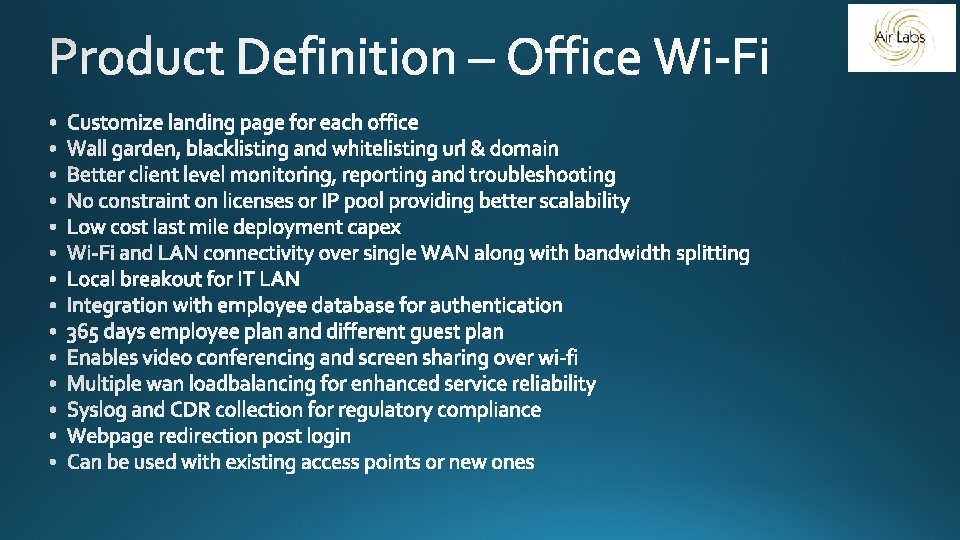 Traditional Offices Smart Offices • Wi. Fi services were primary meant for giving access to IT LAN to employees using LDAP, EAP userid and password or PSK • In-Premise Wi. Fi Solution requires IT team, AMC and Hardware costs • Wi. Fi solution from TSPs are costly and cannot be used to provide IT LAN Services. • It is difficult to use innovative office solutions like office communicators, wireless presentations, wireless printing, asset management and internet access s for vendors and visitors • Local content, town halls and PA messages cannot be broadcasted locally over wifi. • FTP services and file sharing cannot be done over wifi and local storage • Higher bandwidth cost to provide file sharing solutions over internet like google drive. Else investment required to create a separate local wifi network, • Separate network for LAN connectivity with internet access • Vo. IP & office CUG solutions have to be internet based • Major challenges and investment to rollout Shared Workspaces as well as BYOD • Cyber attack prevention both on wireless as well as from internet gateway is difficult to implement without a firewall and UTM • Wireless intrusion prevention, Rogue APs, Rogue Clients and user level bandwidth management are must have requirements which is difficult to implement in traditional setup • OTP based login process for employees is very cumbersome • Both IT LAN as well as regulatory compliant internet access can be given to employees and visitors • Cloud based Wi. Fi Solution eliminates requirement for local IT team, Capex for local hardware and AMCs • Cloud services can work with any internet connectivity provider. Also bandwidth can be aggregated in case of multiple ISP links. • Video conferencing services, office communicators, wireless presentations, wireless printing, asset management and internet access for vendors and visitors can be enabled over Wi-Fi • Cloud services ensures immediate attention from 24 X 7 No. C and all devices on field are managed and monitored. • Local Content or FTP server can be set up to share files, videos and broadcast town halls. • As file exchanges and office communicator will be hosted locally, bandwidth cost will be reduced significantly. • Internet connectivity over LAN can be provided by the same network • Vo. IP and office CUG solutions can be offered over a local server • Ideal solution for shared workspaces and BYOD • Complete protection from cyber attack vai enterprise Firewalls, UTM and secure access points • Differential plans and bandwidth for employees and visitors can be delivered.
