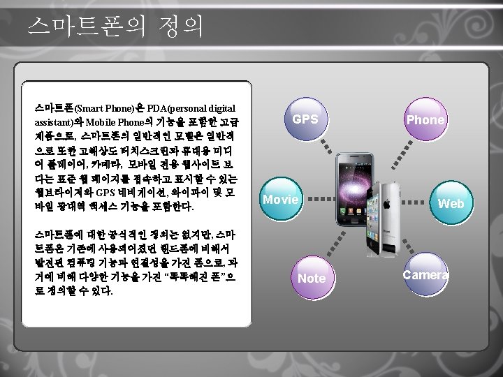 Smart Phone тодорхойолт A smartphone is a high-end mobile phone that combines the functions of a personal digital assistant (PDA) and a mobile phone. Today's models typically also serve asportable media players and camera phones with highresolution touchscreens, web browsers that can access and properly display standard web pages rather than only mobile-optimized sites, GPS navigation, Wi-Fi and mobile broadband access. The term smartphone is usually used to describe phones with more advanced computing ability and connectivity than a contemporary feature phone, GPS Movie Note Phone Web Camera