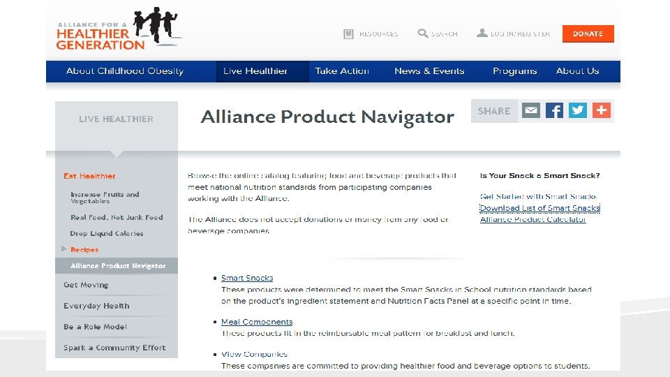 Alliance for a Healthier Generation Product Navigator • https: //www. healthiergeneration. org/live_healthier/eat_he althier/alliance_product_navigator/