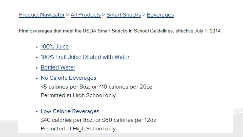 Beverages • Smart Snack Standards High School – Other flavored and/or carbonated beverages with < 5 calories per 8 oz or < 10 calories per 20 oz – No more than 12 oz of beverages with < 40 calories per 8 oz, or < 60 calories per 12 oz.
