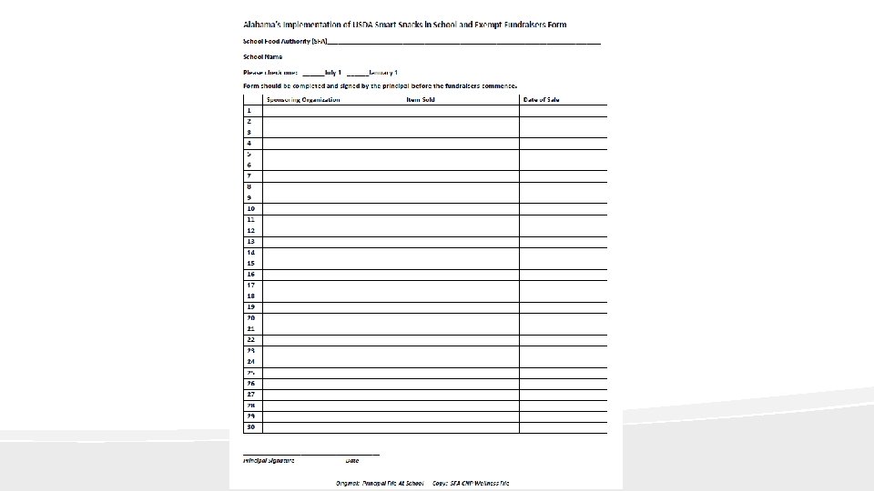 Exempt Fundraiser Procedures-Principals • Complete, approve and sign Alabama’s Implementation of USDA Smart Snacks in School and Exempt Fundraisers Form • Provide copy to CNP Director • Provide documentation of approval upon request by Alabama State Department of Education (ALSDE) for audit review