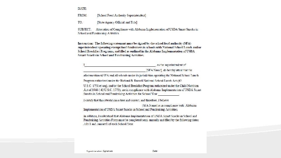Semi-annual Due Dates • July 1– Alabama's Implementation of USDA Smart Snacks in School and Exempt Fundraisers Form – Attestation of Compliance with Alabama Implementation of USDA Smart Snacks in School and Fundraising Activities Form • January 1 - – Alabama's Implementation of USDA Smart Snacks in School and Exempt Fundraisers Form • For each school year