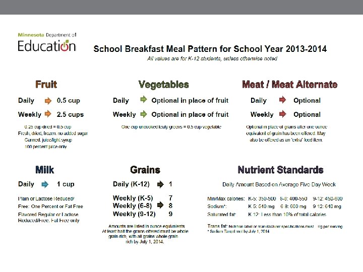 Healthy Hunger-Free Kids Act Breakfast Meal Pattern • Breakfast Meal Pattern requirements phased in over the course of two years • 2013 -14 SY: • Follow food-based menu planning approach • Meet calorie ranges and nutrient standards • Eliminate trans-fat • Ensure half of all grains offered are whole-grain rich • 2014 -15 SY: • Follow food-based menu planning approach • Meet calorie ranges and nutrient standards • Eliminate trans-fat • Ensure ALL grains offered are whole-grain rich • Additional fruit requirement • Meat/Meat Alternative options may be substituted once Bread/Grain requirement is met • Intermediate sodium specifications established for 14 -15 SY.