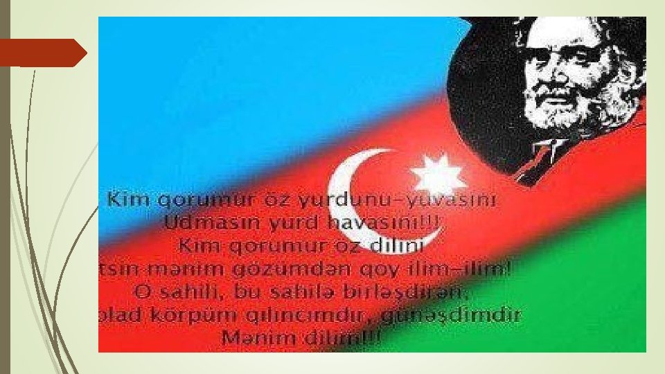 Mənim ana dilim-mənim kimliyim, Pasportum, özümə öz hakimliyim. Məni həm babamla, həm də nəvəmlə Bağlayıb uzanan tarix bağımsan. Dünənim, sabahım, üstəlik hələ Mənim söz hünərim, söz bayrağımsan. B. Vahabzadə