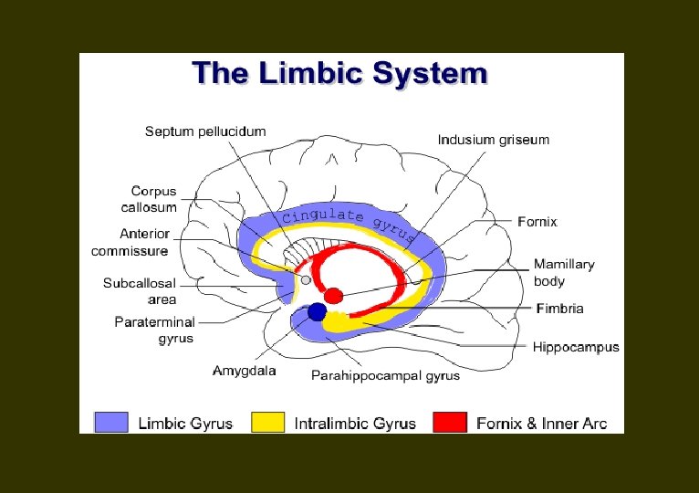 Amygdaloid complex n Within uncus n Process sensory information n Determines emotional level, especially negative n Modulates affective expression n Autonomic, endocrine and affective reactions – Aggression when stimulated – Calm, fearless in damage