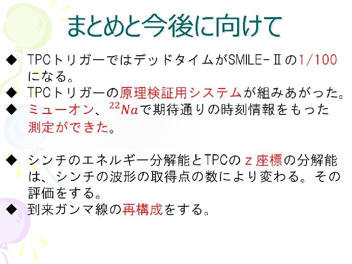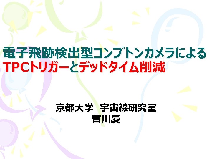 ミューオン測定のセットアップ 電場 ~ 150 V/cm ドリフト速度 ~ 6 cm/μsec Scinti. trigger drift top -3000 V GEM top -800 V GEM bottom -500 V u. PIC +330 V TPC 最大ドリフト時間 ~ 2. 4 μsec シンチ 14. 5 cm GEM 0. 4 cm μPIC