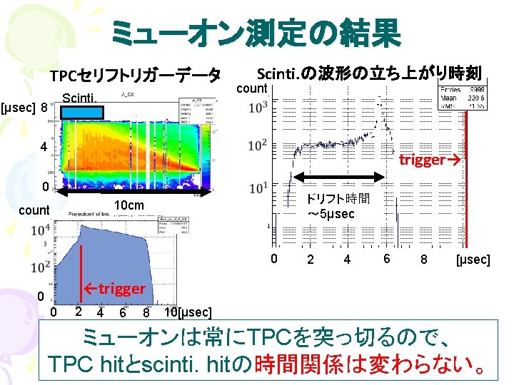シンチの波形の重ね合わせ ADC 4 us scintillator hit TPC hit FADC coincidence 0 2 8μs 4 6 8[