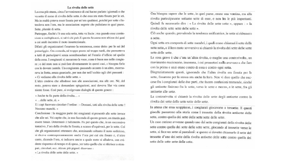 Oppositions-distinguos torpedone/torre col pedone scorsi/preteriti tipo giovinotto munito/scimunito incoronato/incornato un gallone un lunghissimo collo jeu paronymique avec inclusion jeu homonymique scorsi/scorsi jeu synonymique scorsi/preteriti calembour polysémique sur tipo calembour homophonique in absentia jeu sémique sur l’opposition otto/sette jeu paronymique avec inclusion calembour paronymique in praesentia calembour polysémique sur gallone calembour polysémique