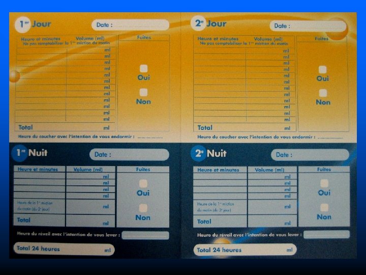 Classification des troubles mictionnels n Symptômes liés au stockage (les plus fréquents) – – n pollakiurie diurne nycturie (pollakiurie nocturne) impériosités ou urgenturie incontinence par impériosités Symptômes liés à la vidange vésicale – faiblesse du jet – dysurie d’attente ou de poussée – miction en plusieurs temps n Symptômes post-mictionnels – sensation de vidange incomplète – gouttes retardataires