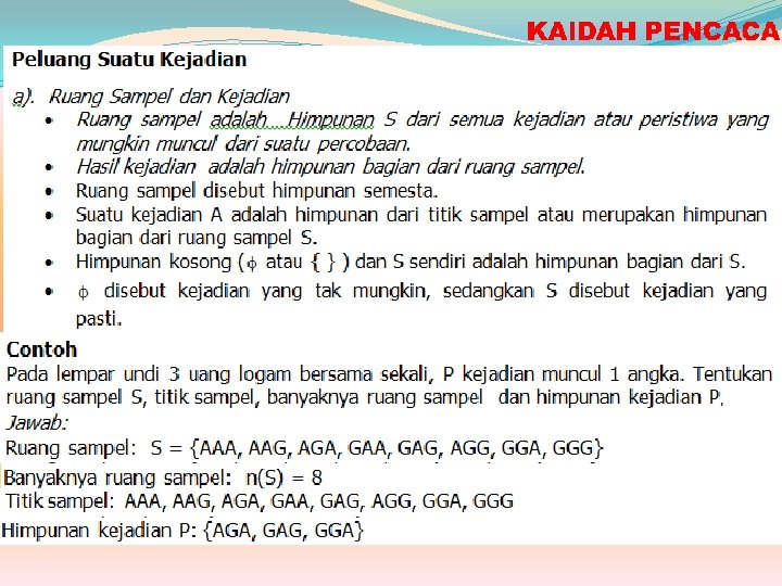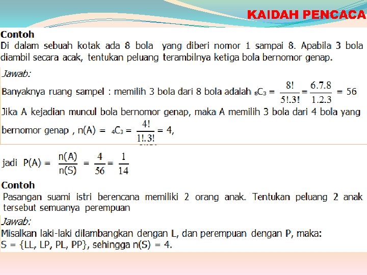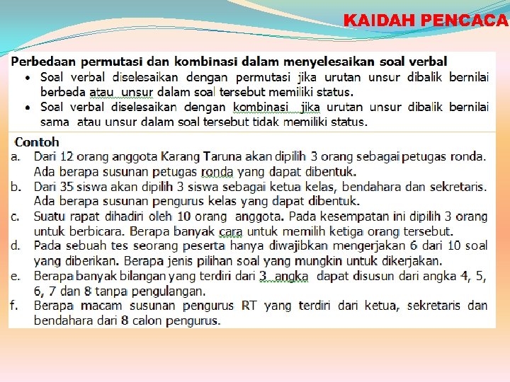 KAIDAH PENCACAHAN, PERMUTASI DAN KOMBINASI MELIPUTI : 1. Aturan Perkalian 2. Permutasi 3. Kombinasi