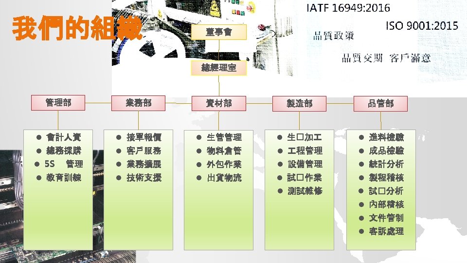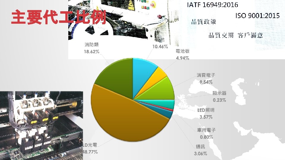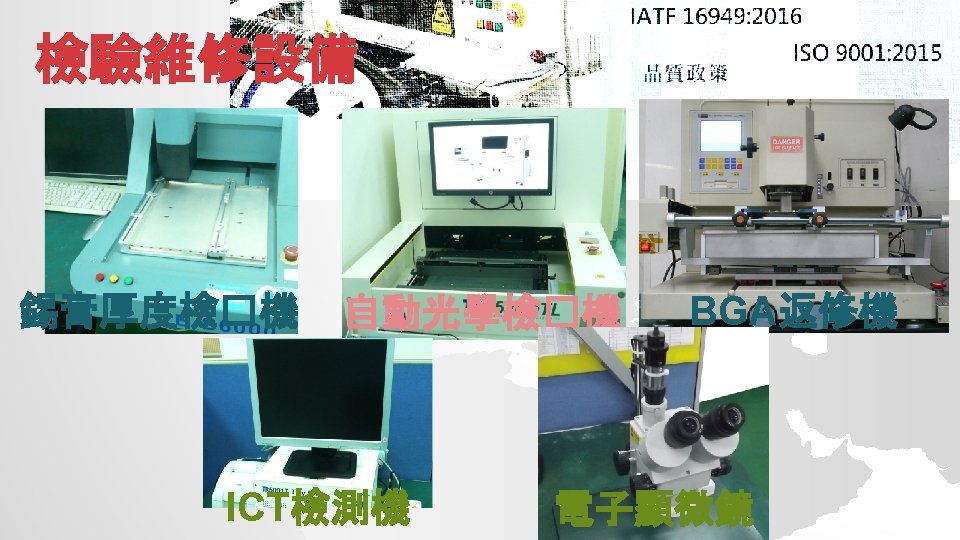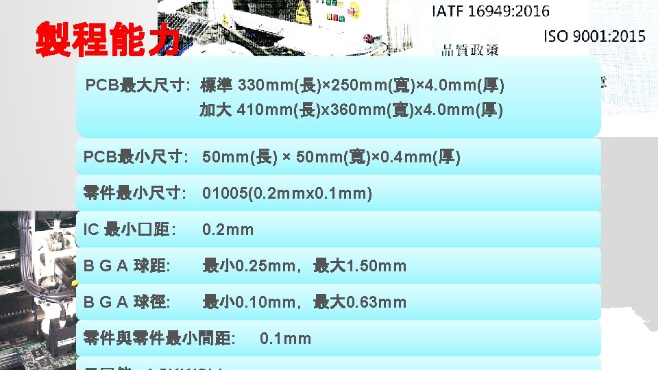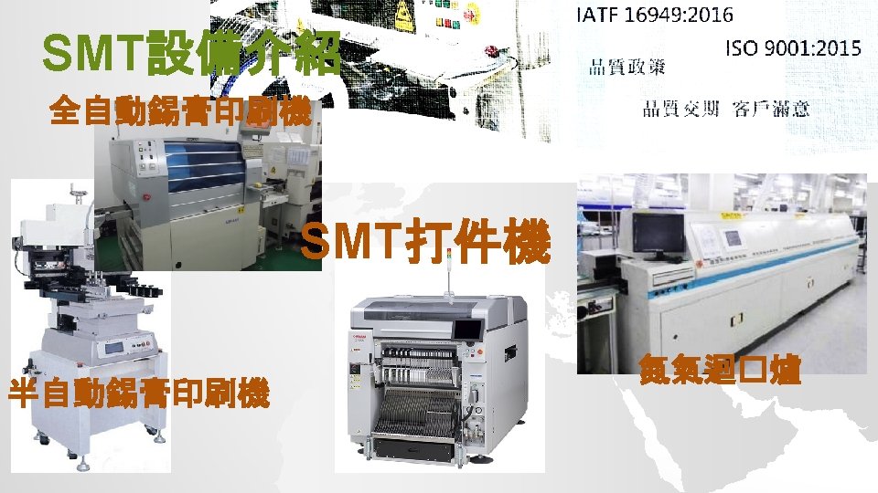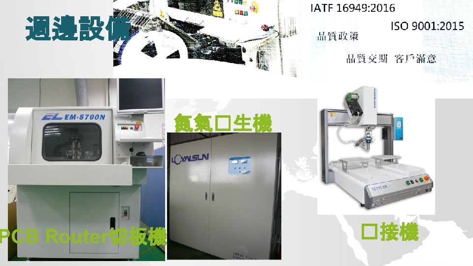 生�設備 SMT LINE A MINAMI 印刷機+JUKI KE 2070*2+JUKI KE 2060+氮氣迴焊爐 LINE B MINAMI 印刷機+YAMAHA G 5 S+JUKI KE 2060+氮氣迴焊爐 LINE C MINAMI 印刷機+JUKI KE 2070+氮氣迴焊爐 LINE D MINAMI 印刷機+YAMAHA G 5 S + 氮氣迴焊爐 LINE E MINAMI 印刷機+JUKI KE 2050*3+JUKI KE 2070+ 氮氣迴焊爐 手焊站 禾宇 自動焊接機* 3