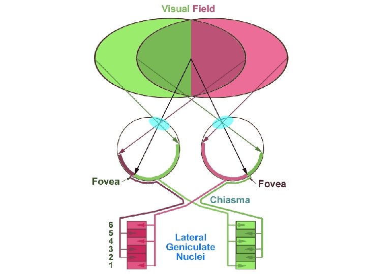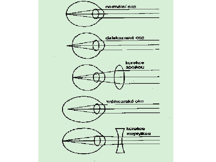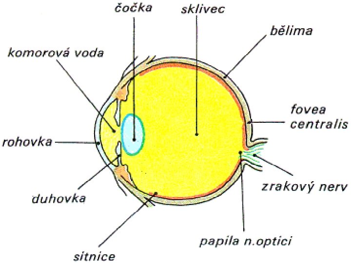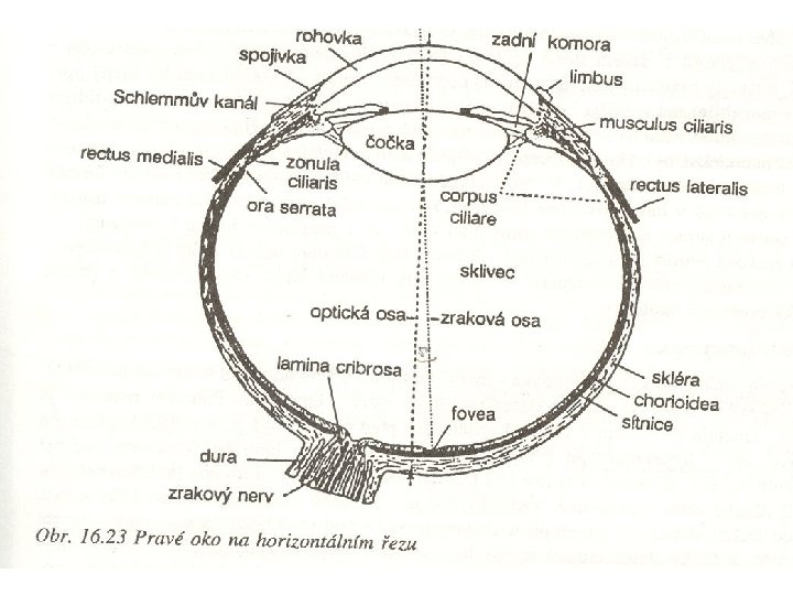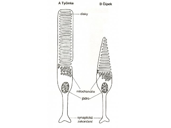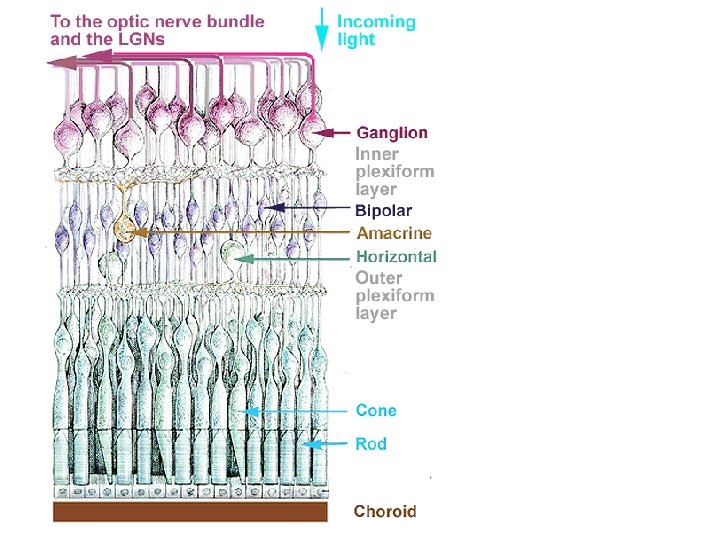 Optický nerv Vnitřní ohraničující membrána Gangliové buňky Bipolární buňky Vmezeřené horizontální buňky Sóma tyčinek a čípků Vnější ohraničující membrána Oblast tyčinek a čípků Pigmentová vrstva