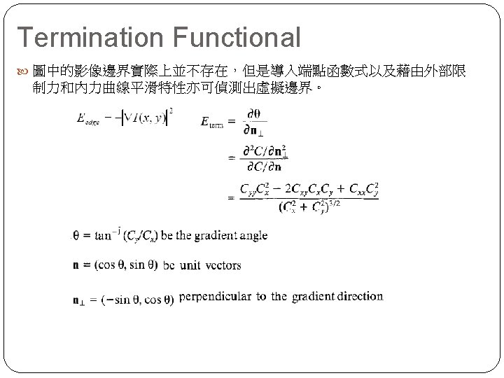 Edge Functional 外部能量的目的在於將snake牽引至影像的明顯特徵處,像是影像灰階值 變化較大處(intensity value) 或邊緣(edge) 。 If we set then the snake is attracted to contours with large image gradients.