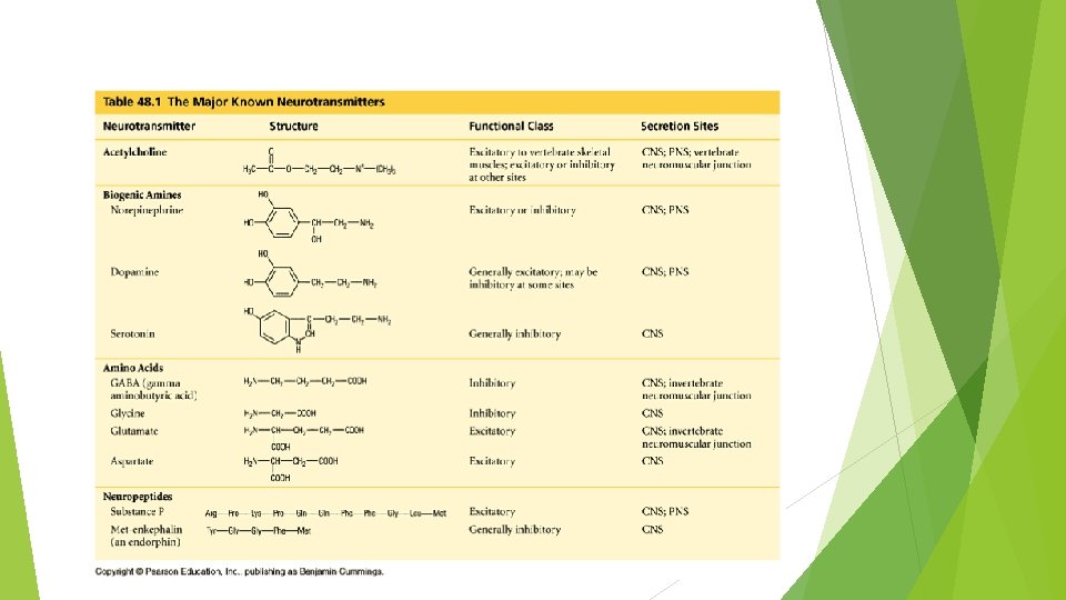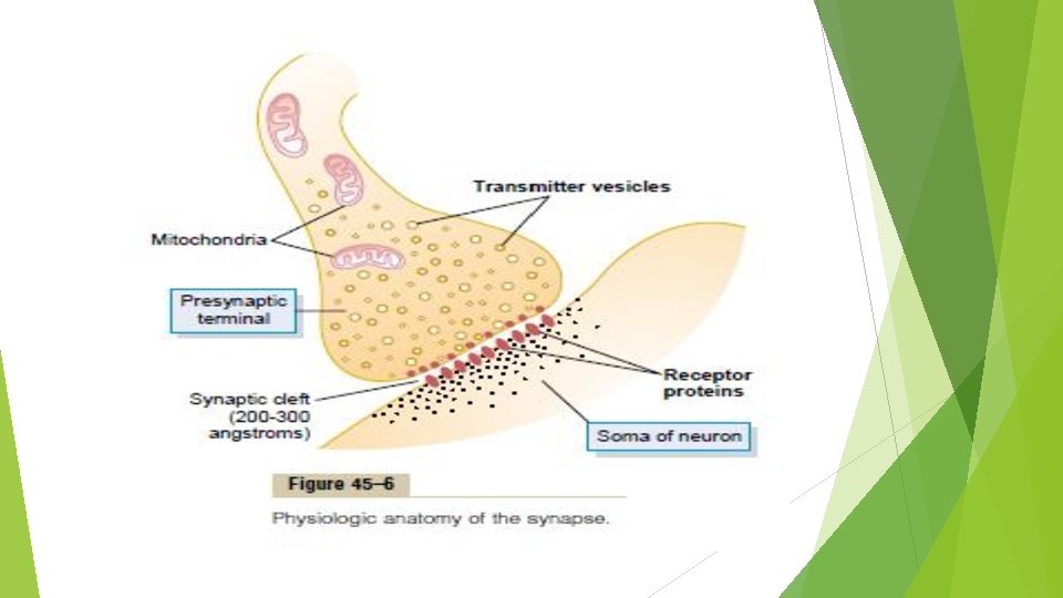 Transmitter veziküllerde bulunan transmitter maddesi sinaps aralığına serbestlendiği zaman, postsinaptik nöronu eksite ya da inhibe eder. Nöron membranı eksitatör reseptörleri içeriyorsa eksitasyon, inhibitör reseptörleri içeriyorsa inhibisyon görülür. Bazende hem inhibitör hemde eksitatör olarak görev yapan nörotransmitterler de bulunur(norepinefrin). Bunların birden fazla reseptörü bulunur. Nörotransmitter exitatör reseptöre bağlanırsa uyarıya, inhibitör reseptöre bağlanırsa inhibisyona sebep olurlar. Sinaps aralığına salgılanan nörotransmitterler, çok kısa sürede etkilerini gösterirler, sonra da ortadan kaldırılırlar.