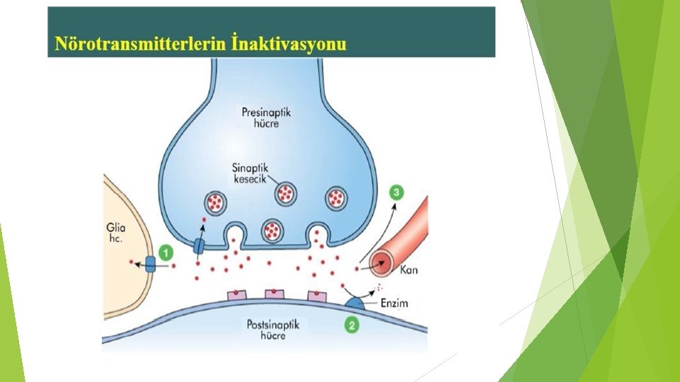 Nörotransmitterlerin sinaps aralığından uzaklaştırılmaları 3 şekilde olur: 1 - Sinaptik aralıkta yada postsinaptik membranda bulunan ve nörotransmittere özgü olan enzimlere katabolize edilmesi, YIKILMASI. 2 - DİFÜZYON: Sinaps aralığından, etraftaki interstisyel sıvıya difüze olarak kana karışması. 3 - GERİ ALINMA: Nörotransmitterin kendisini salgılamış olan presinaptik membran tarafından tekrar geri alınmasıdır.