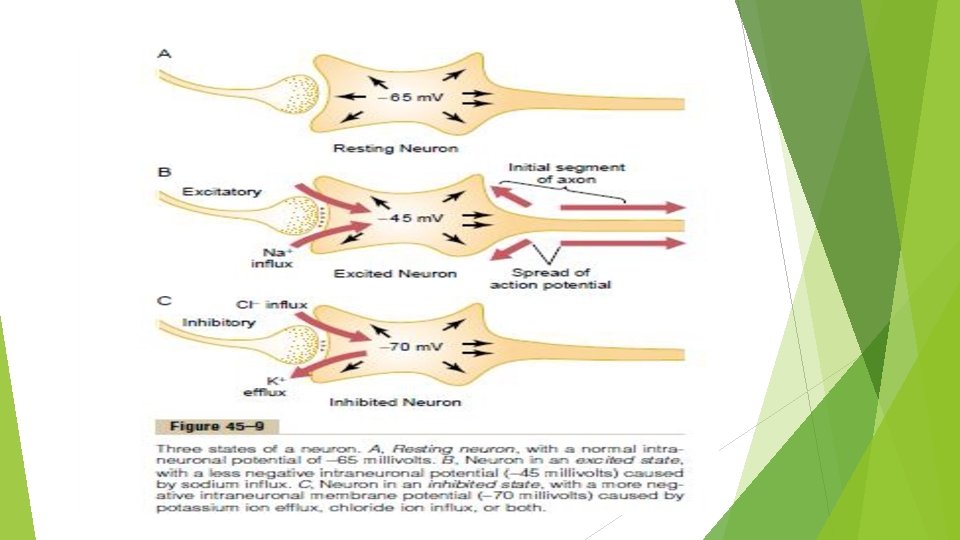 Reseptör İNHİBİTÖR karakterde ise; membranın Cl- veya K+ iyonlarına karşı geçirgenliğini artar ve membran dinlenim potansiyeli daha da negatifleşir. Örneğin -65 m. V tan -70 m. V ‘a düşer. Meydana gelen lokal potansiyele inhibitör postsinaptik potansiyel (IPSP) adı verilir.