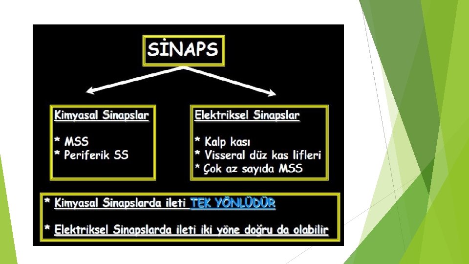 SİNAPS Ti. PLERİ Sinapslar iki çeşittir: � 1. Elektriksel sinapslar, � 2. Kimyasal sinapslar. �İmpulsun bir nörondan diğerine geçişi kimyasal madde ile gerçekleşirse " kimyasal sinaps"; elektriksel aktivite ile gerçekleşirse "elektriksel sinaps" adını alır. �Sinaps iletisinin çoğunluğu kimyasal sinapslarla gerçekleşir.