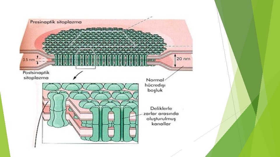 Elektriksel Sinapslar �Az sayıda olan elektriksel sinapslar, iletileri doğrudan ileten direk kanallardır. Bunların çoğu, küçük protein tübüllerinden oluşur. Gap junction (yarık bağlantılar) adı verilen bu yapılar, bir hücrenin içinden diğerine iyonların serbest hareketliliğini sağlar. �Sinir sistemindeki elektriksel sinapsların önemi fazla değildir. Daha çok dentritler ile dentritler arasında bulunur. Dentrit-akson, akson-akson arasında bulunmazlar. �Çok az durumda hücre membranları arasındaki mesafe çok dardır. Akım direkt olarak diğer hücreye atlar.