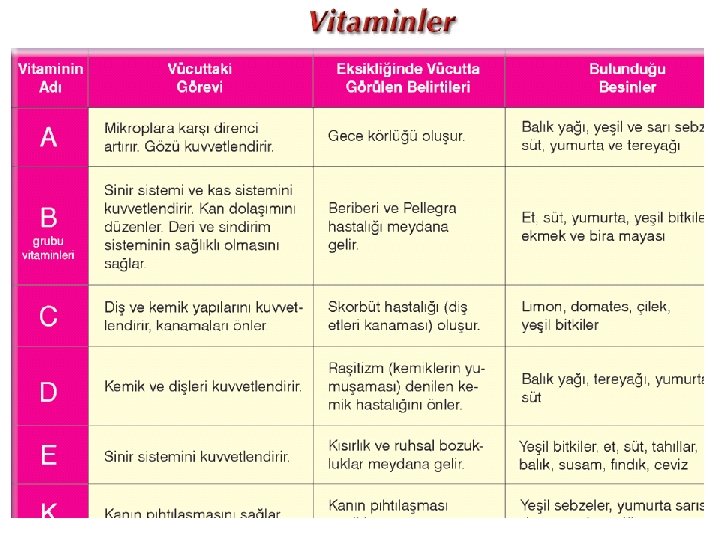 YAĞLAR Diğer besinlere bulundururlar oranla Vücudumuzda ihtiyaç olarak depolanır. iki fazlası kat enerji besinler yağ A, D, E, K vitaminleri yağda çözünür. Yağlar deri altında depolanarak canlıyı çarpma ve darbelere karşı korur. Ayrıca iyi bir ısı iletkeni olmadığı için vücudu soğuğa karşı korur. Ayçiçeği, fındık, zeytin, soya da bol miktarda bulunur. Yağlar vücutta enerji üretmek için ikinci sırada kullanılırlar. Salatalara neden yağ dökülür?